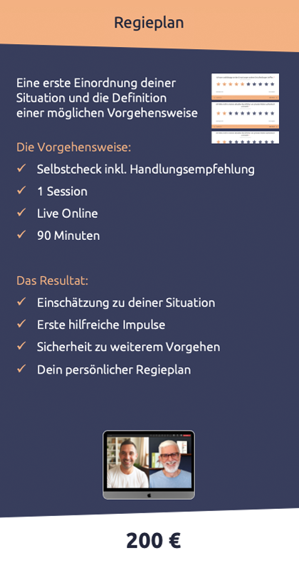 Nein. Der Selbstcheck ist kostenfrei und unverbindlich. Der Regieplan ist genau das: eine gemeinsam entwickelte Orientierung. Ohne Verpflichtung zur Umsetzung.