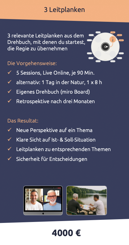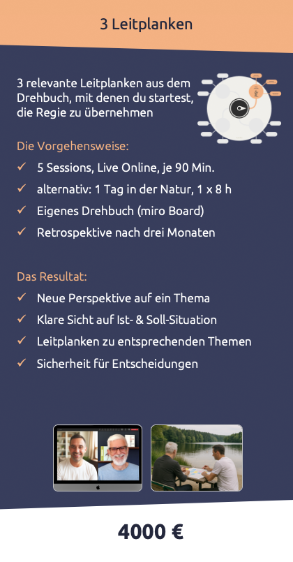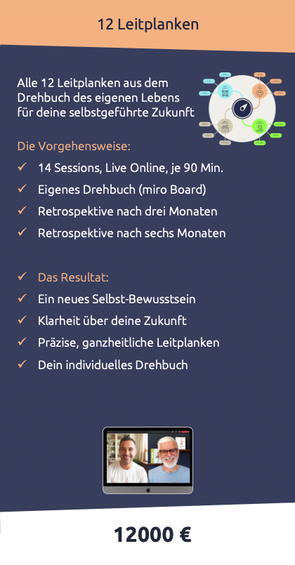 Du erhältst zu Beginn dein eigenes Miro-Board – da arbeiten wir gemeinsam. Dort halten wir deine bis zu 12 zentralen Leitplanken fest. So entsteht Schritt für Schritt dein persönliches Drehbuch des eigenen Lebens. Ein klares Arbeitsinstrument, auf das du nach unserer Arbeit jederzeit zugreifen kannst.